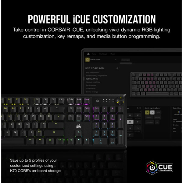 CORSAIR Vezetékes Billentyűzet Gaming, K70 CORE RGB, Mechanikus, MLX Red switch, 104 gombos, US, fekete
